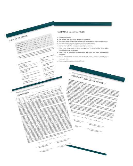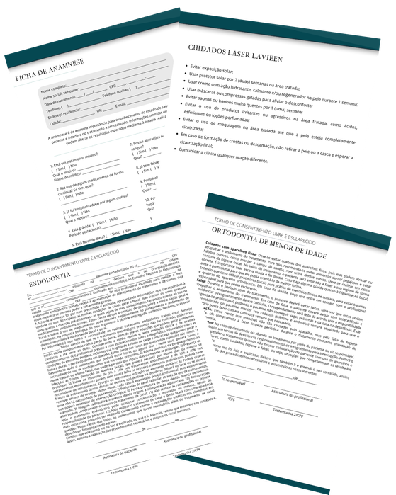 Anamnesis clínica completa Anamnesis clínica simplificada Presupuesto editable Renuncia al tratamiento Contrato de pago editable Expediente de conclusión del tratamiento Autorización de uso de imagen Plan de tratamiento Certificado/justificante médico Formularios de Procedimientos y Planificación de Estética Orofacial (HOF) Formulario para relleno Formulario para peeling facial Formulario para toxina botulínica Formulario para ultrasonido microfocalizado Términos Odontológicos Visuales y Tradicionales Consentimiento informado de periodoncia Consentimiento informado de restauración Consentimiento informado de endodoncia Consentimiento informado de ortodoncia Consentimiento informado de ortodoncia invisible Consentimiento informado de limpieza dental